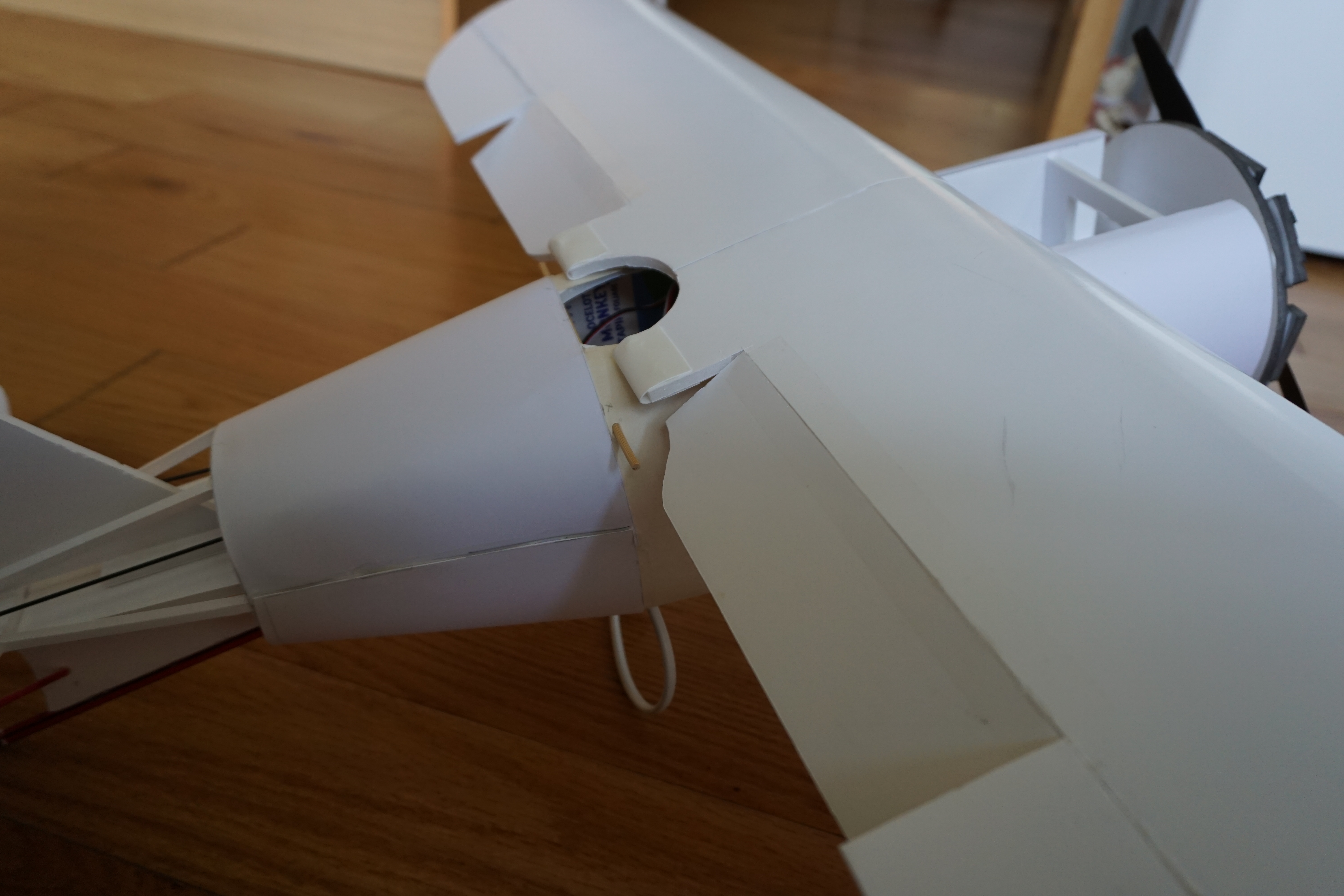 Here you can see the flaps in their deployed position. Servos glued to the underside of the wings operated them smoothly. However, before the maiden flight, one of the servos was found to be faulty with stripped gears. Whoops! I had no idea how this had happened, but, as I'd already decided not to use flaps on the maiden flight to keep it simple, I decided to simply secure the flaps in place and fix them later. This way I wouldn't waste time and effort if the first crash had been a total write-off.