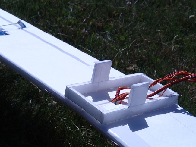 Due to the wings being angled up 4 degrees from horizontal, a raised wing retainer needed to be built. I made this version with tabs that are inserted into the fuselage, but after more thought, this seems like a bad idea in the case of a crash. If I make another version, I would probably make a triangular shape that is permanently attached to the fuselage and a small v-shaped groove in this attachment so that the rubber bands would stretch and the wing could slide off without causing damage to the body.