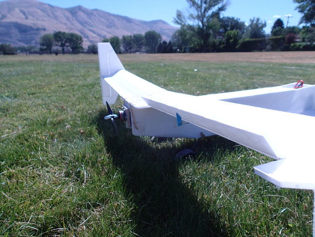 I also think that I would make the wings a bit wider. The lift to weight ratio of these 5 inch wings (which are close to scale) just seems a bit small for any kind of low-speed flying, so making them 7 inches would probably improve things, but it would still need a much beefier motor.