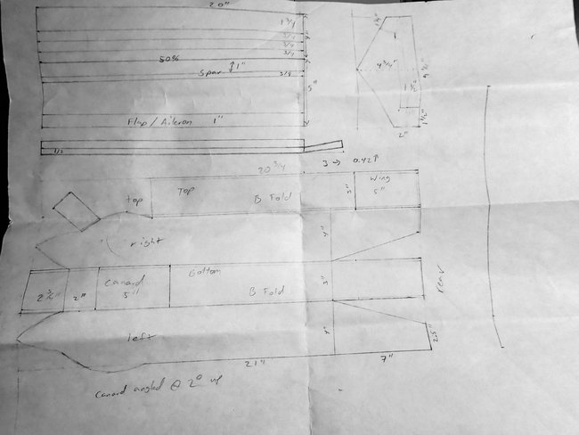 After measuring every picture I could find, I made a list of all the general dimensions and sketched out some initial plans for something that is approximately 1/7 scale (14.8%) with a 40 inch wingspan.