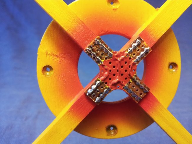 To make the cross of the frame even more rigid, I made a cross shaped power distribution board out of PCB experimental board material and glued the board to the bottom of the wood cross. A small power distribution board eliminates the need for a battery harness. This is a good thing since a harness would be a tight fit and add unnecessary weight to the small quad frame. Remember the design goal; Not one gram extra.