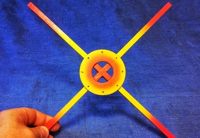 After some research I choose to use 8 mm (that is roughly 1/4 inch) pine wood spars for the arms and a plywood piece as mounting plate. I considered more exclusive materials like carbon and different plastics, but they are a lot harder to work with and the lower weight is negated by the added weight of the necessary mounting fixtures. In comparison wood glue will make a perfect fixture for the arms to the plate. The weigh of the glue is next to nothing.