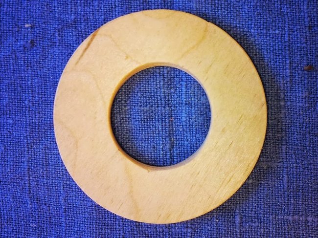 To cut out the outer circle I used an electric jig saw. A small hand saw would also have worked. In order to make the edge round and smooth I drove a larger nail through the mark left by the small nail and fastened the nail in a drill. This setup made for a low tech wood lathe. A file and some sand paper was all that was needed to make a perfect circle out of the somewhat jagged piece of plywood.