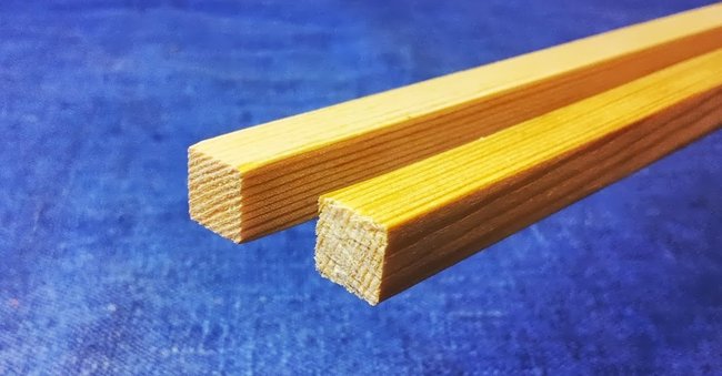 To make the frame I started by cutting cut two 33 cm pieces of wood spar. In the middle of each spar I made two slots 8 mm apart with a saw. I then chiseled out the wood in between the slots. After some filing the pieces fit together to form a perfect cross. If done properly, this technique makes for a very strong construction.