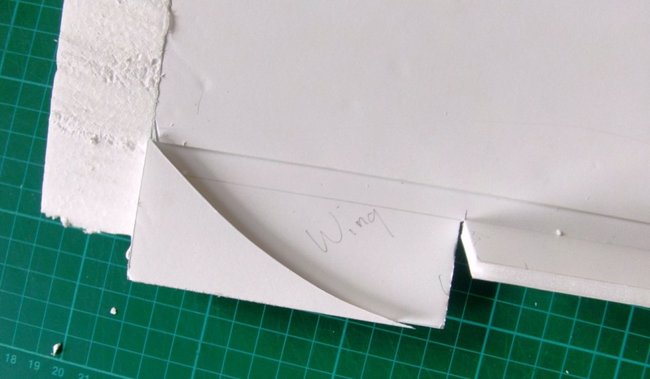 Lots of thin cuts, with a slight sawing action! With the kitchen knife I find I can rest a good portion of the blade on the paper, which helps pick up the shape of the wing and extend it onto the foam for the last few cuts.