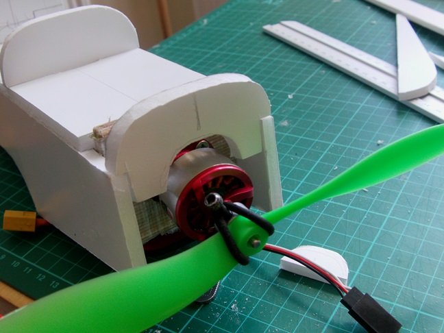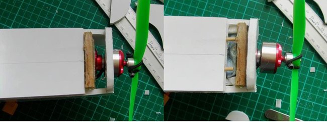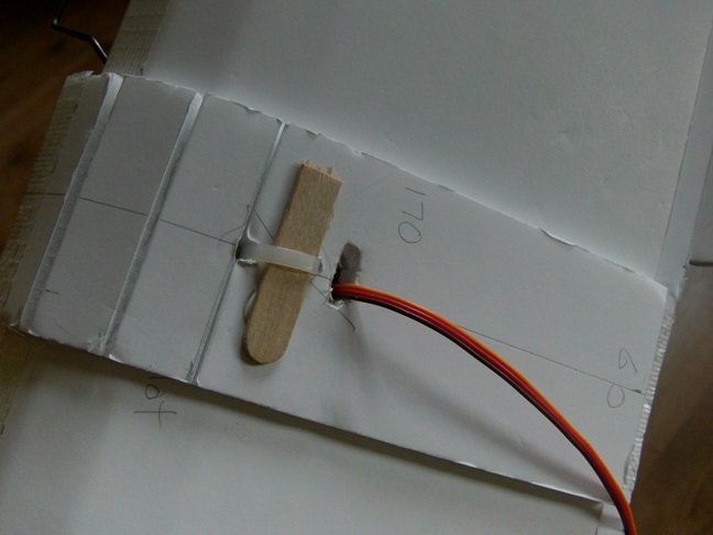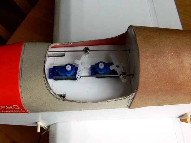 Here’s the servos at the front. These aren’t glued-in yet as I’ve still to paint the model. (Before painting stick a little bit of masking tape over the foamboard to keep an area clear for hot gluing.)