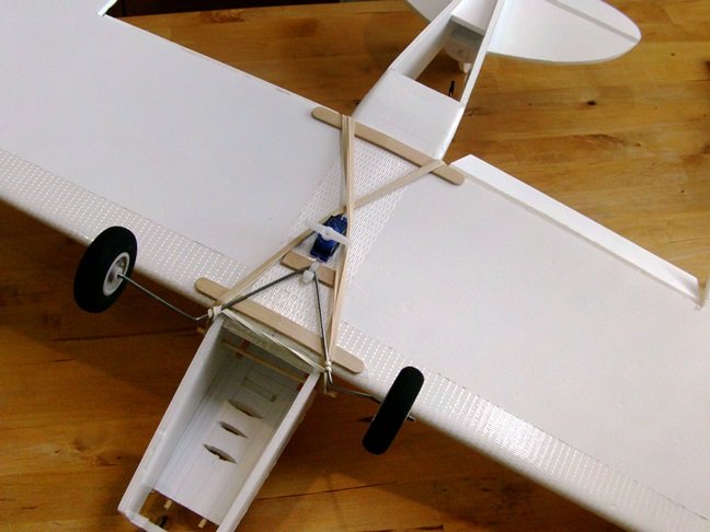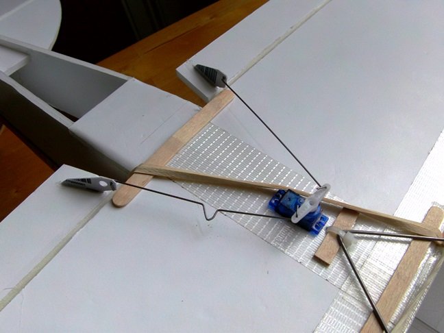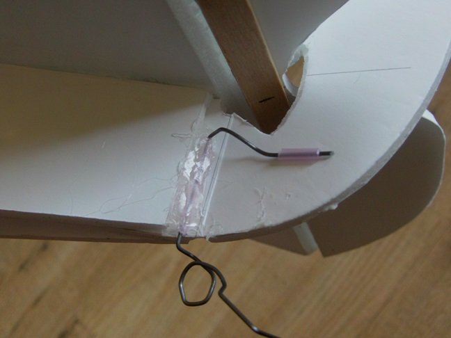 The top of the wing – zip-tie holding the undercarriage in place with reinforcement. Feed hole cut for the servo wire.