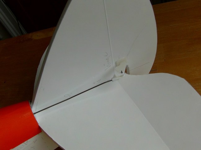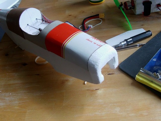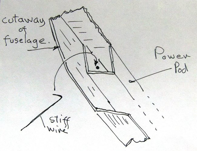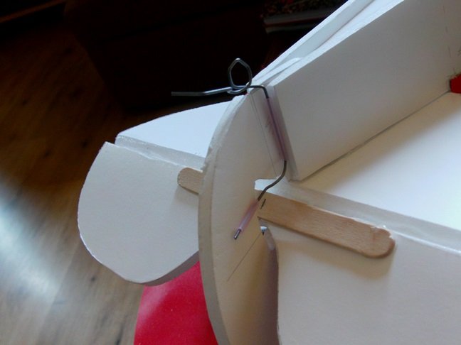 If you’re locating the rear swappable pod skewer later in the build, here’s a way to do it - locate the pod in the fuselage and then use a bent wire to poke a hole through the foamboard from the inside.