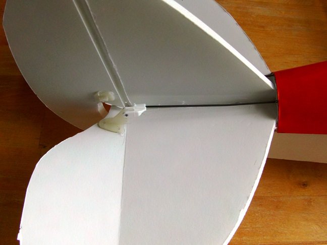 Elevator control horn. Again you can just see a little bend in the control rod. I’ve still to fit two small screws through the horn, which will catch on the popsicle stick underneath and make everything super-secure.