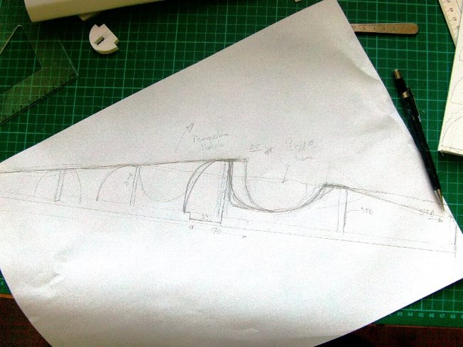 I actually decided on the turtle deck profile for this version of the Tribewt a little earlier in the build by sketching it out above the fuselage. For ease of construction I’m using the slots provided in the BB plan for the turtle deck formers, plus one extra former partway down the tail.