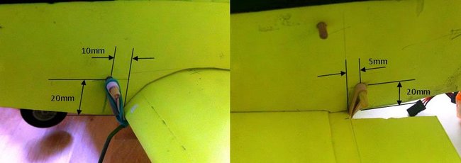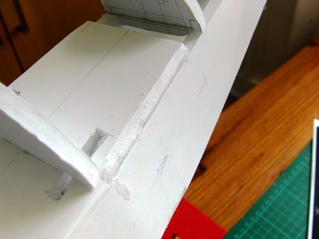 Add some shape to the trailing edge of the wing. Take the cut through this point in the wing, just where the foam starts to get fatter (and stronger).
