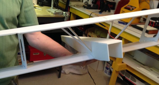 Mark the shape of the lower wing and cut the fuselage to fit the wing. Once you are happy with the fit making sura that the bottom of the wing is paralel to the top flat part of the fuselage proceed to glue.