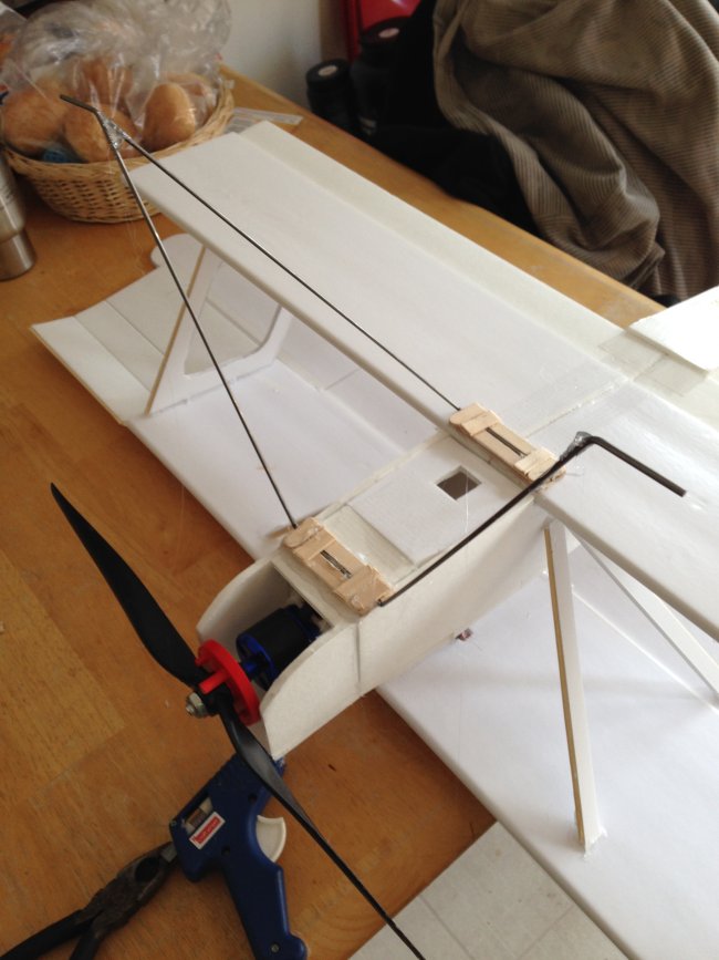 I used hot glue to attached the piano wires for the landing gear, much easier and durable. I also used popsicle sticks and hot glue to fasten the landing gear to the fuselage.