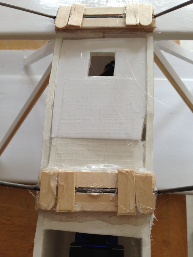 Glue a popsicle stick to the bottom or the top of the elevator to connect the two elevators strongly. Elevator and rudder servos are installed as far forward in the fuselage as possible.