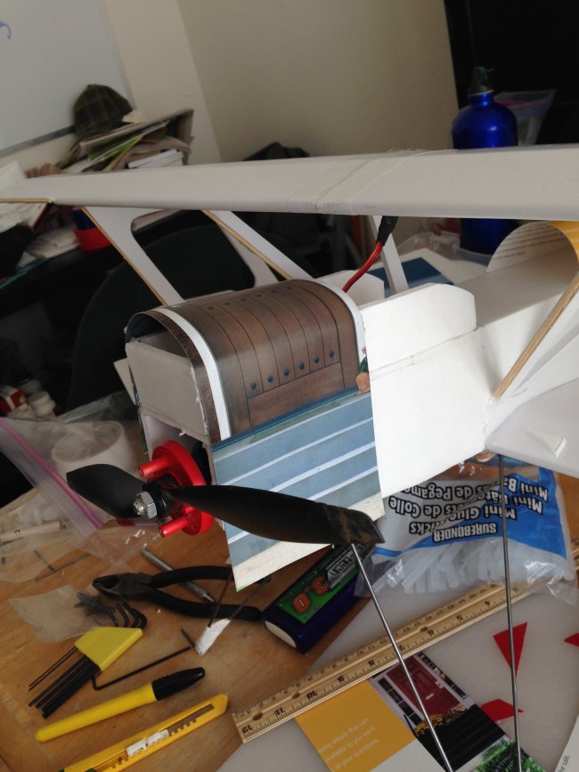 Leave the uper part of the body open to slide the battery pack as far forward as you can after installing the motor and propeller. Once the motor is install cut foam pieces accordingly to cover the motor and do the cowling with poster board like shown on the picture below.