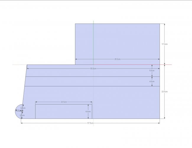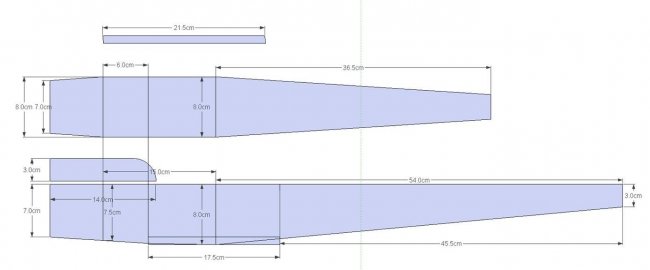 I studied the pictures of the plane in all three dimensions and I used Sketchup to make the plans. I trace the shape around the Flair Magnatilla and created a scale that would fit in the 20”x 30” Adams Foam Board and always most important that will fit in my car! This time the plans and measurements are at scale in centimetres.