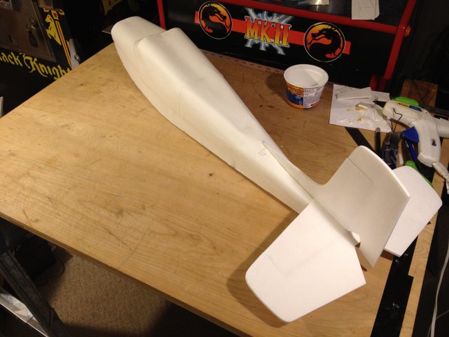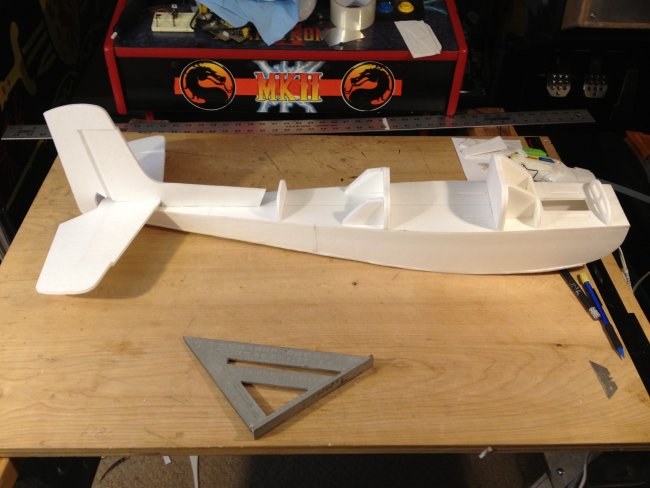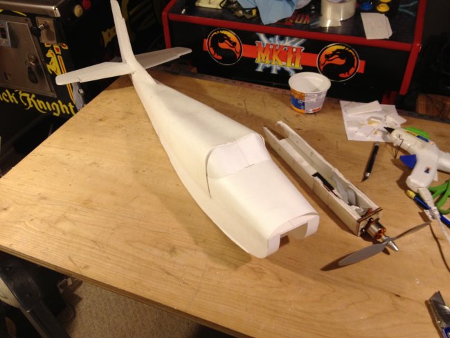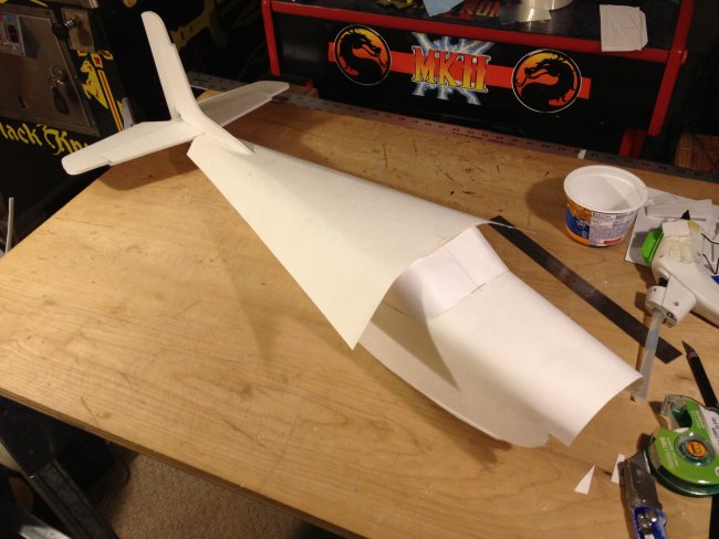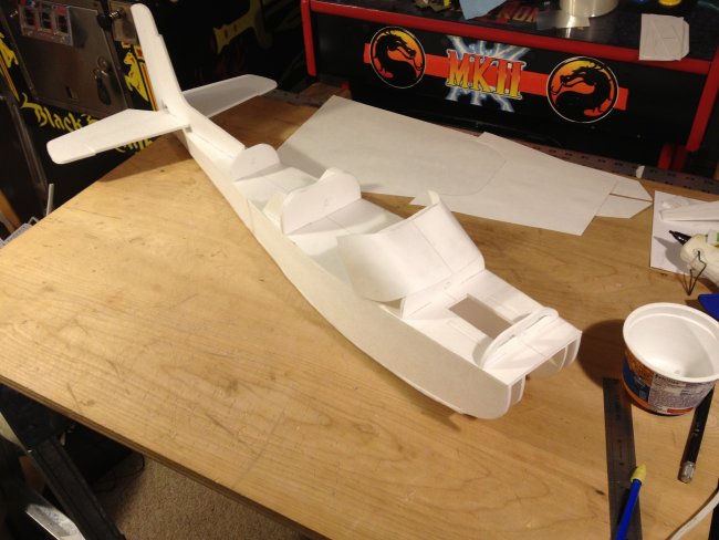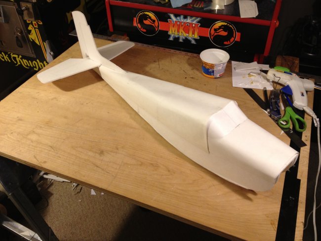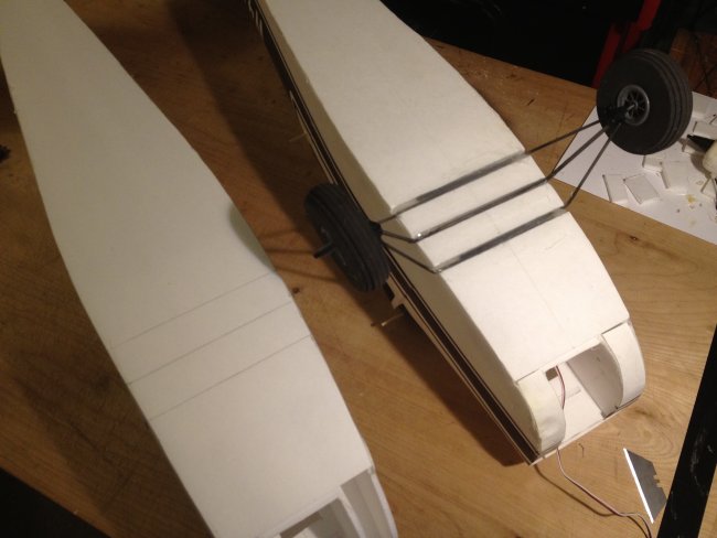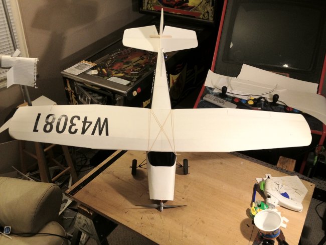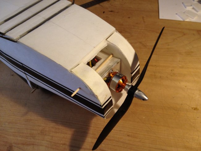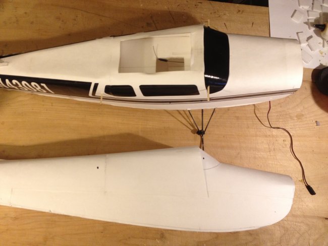 I adapted your design and went one step further and changed the pattern to make it look like a Cessna 152 changing the shape of the wing (not symmetrically tapered but with straight leading edge) and using the classic Cessna tail fin plus the dorsal fin that runs all the way to the rear window. I lowered the turtledeck back using the same curled cardboard technique and introduced a rear windshield constructed like the front one. My dilemma now is how to mount the front wheel (it should be a tricycle) and that I have to re-invent the nose part of the construction for a sturdy wheel mount and for the motor. Wish me luck! I wish I could post the picture here; I'm trying the facebook photo url instead: https://scontent-ord1-1.xx.fbcdn.net/hphotos-xat1/t31.0-8/11393671_1151493114868155_757419988951142257_o.jpg