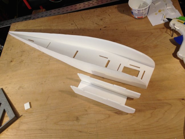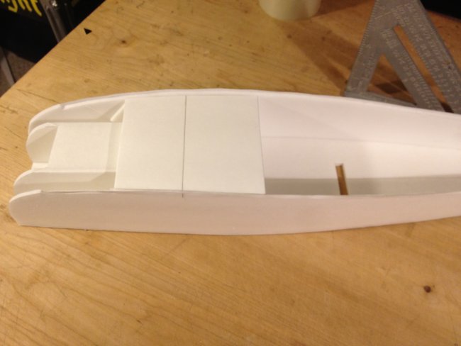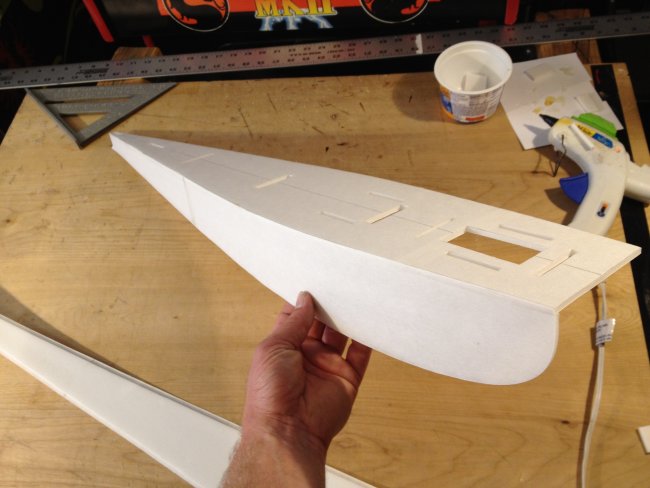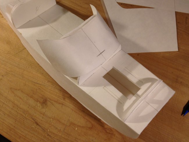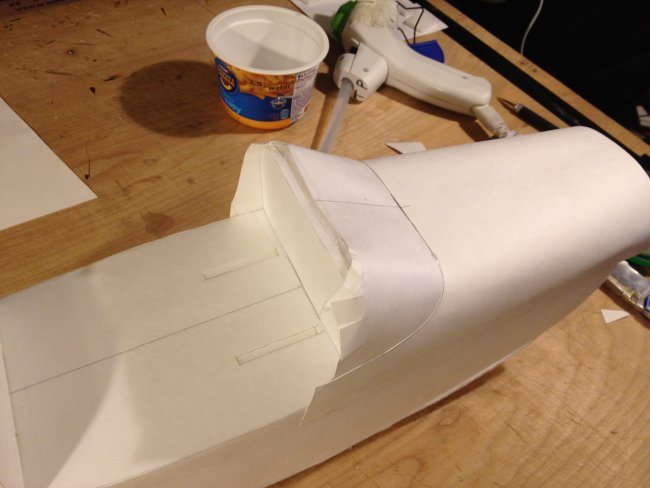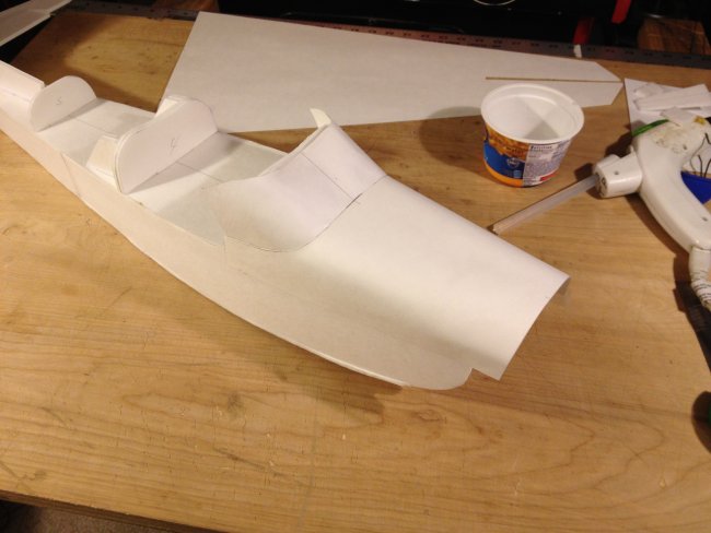 Then time to mount the turtle deck.. The plans have to cut lines for the rear turtle deck. One is left long if you want to get detailed with it? Or just cut it at the first lines and slap it on... You will want to pre-contour the posterboard or this step will be difficult. roll it. creace it, rub it. whatever. Just so its something like this angry duck looking thing.