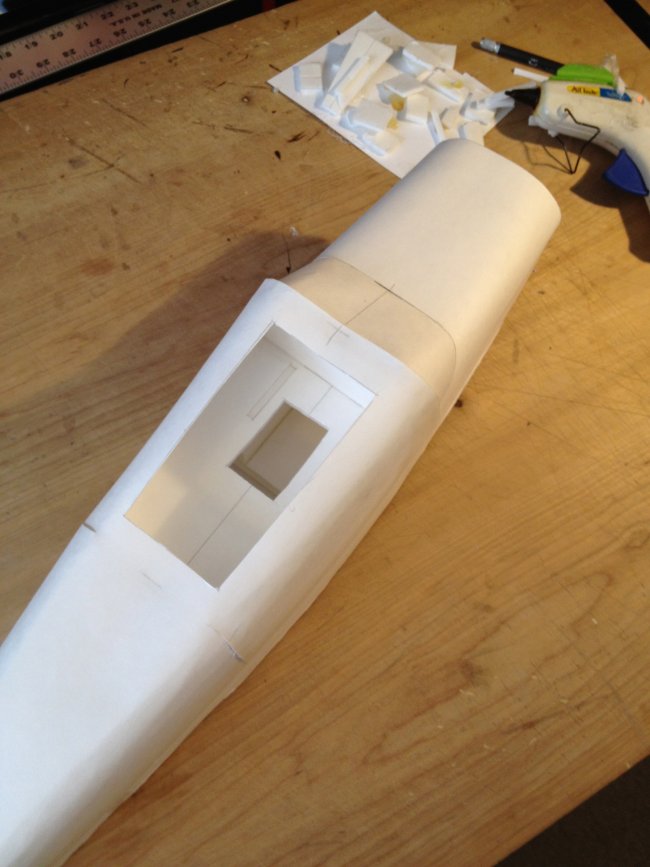 Not included in the plans but you can add slices of posterboard to the nose of the fuselage to fill the gap of the powerpod sleeve. Makes it look nice and I bet it adds to the already impresive sturdiness.