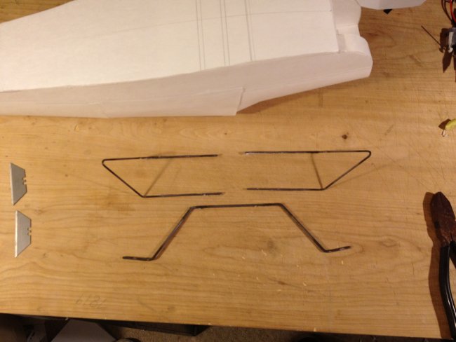 Bend some steel into the landing gear. The prints show you the shape of these. Get some grips, and a torch and this becomes stupid easy to do. Or use what you got. Got a crack in your garage floor? Vice! be creative.