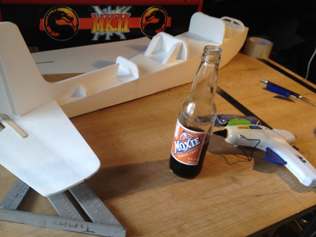 Now glue your #6 formers on. Glue them on that blue line in the center of the tail mounting hole. Then enjoy a beverage.. And look at your half battleship half plane looking workbench masterpeice.