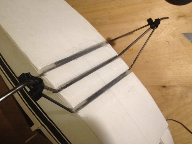 Another angle to see how to put it all together.. The Zip-ties loop through each other and aroud the side supports. If you need to see it I learned the method in the Storch video. works good. When you crash you just tweak it a bit and break a zip tie. Nothing that I couldn't fix bare handed, and with a zip-tie or two.. Whats pictured here is a gear thats on its 3rd plane. Rugged.