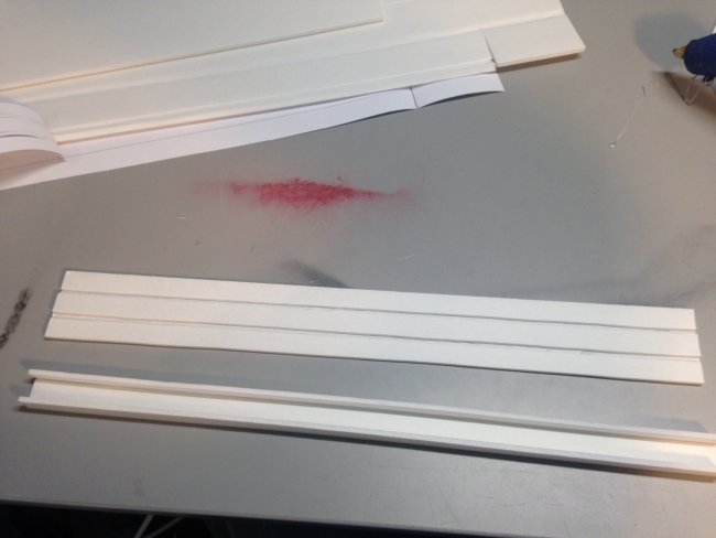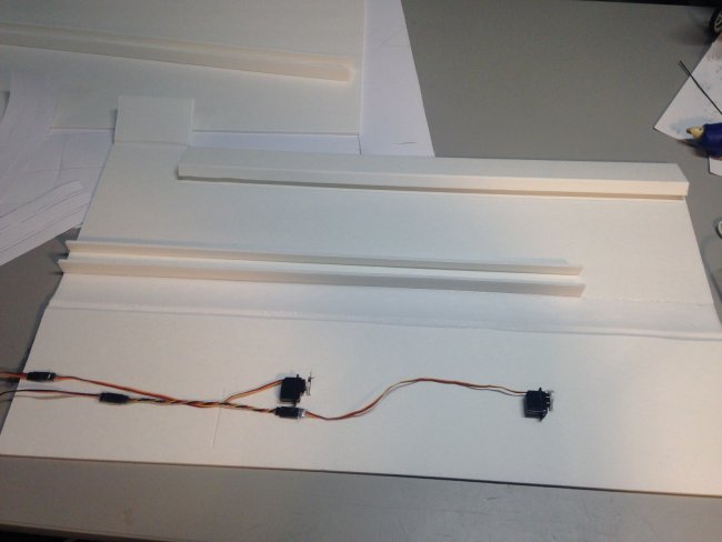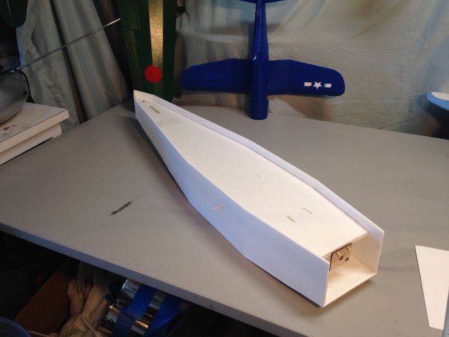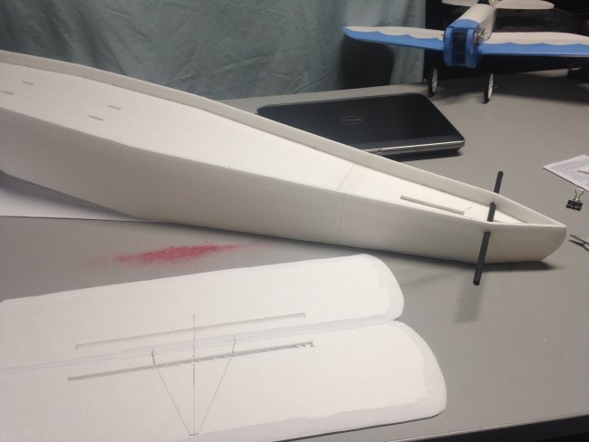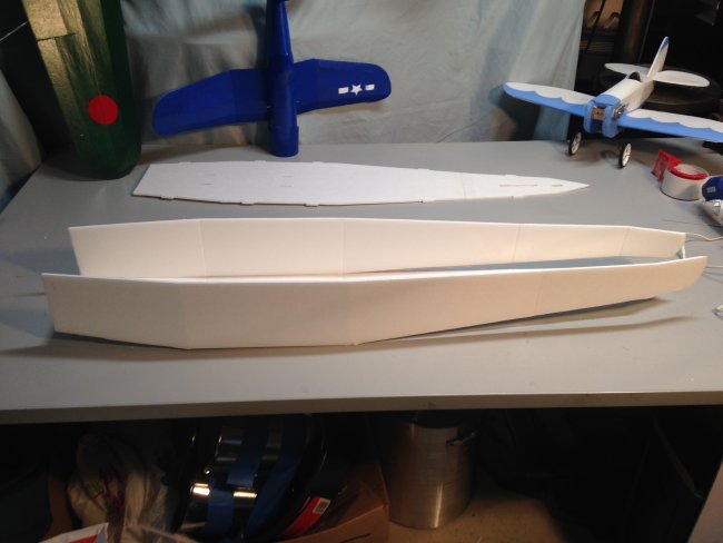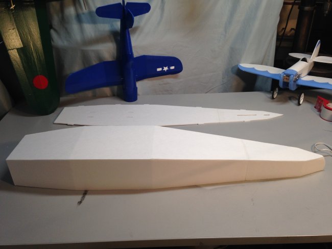 The fuselage cut out and ready to assemble , including power pod plate. Notice that the fuselage is longer then one sheet of foam board. Two pieces of foamboard were taped and then hot glued together.