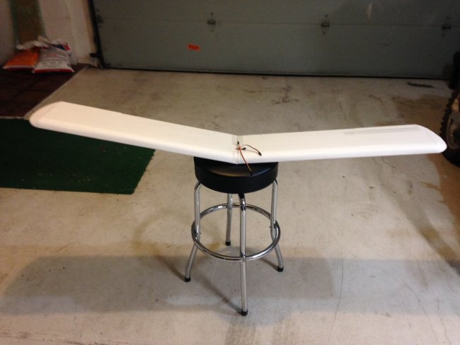 Both wings built and assembled together; Wingtips are also installed. There is a 1/4" carbon fiber shaft run through the center of the wings next to the main spar for support. I also used craft sticks in the wingtips to make them more ridged.