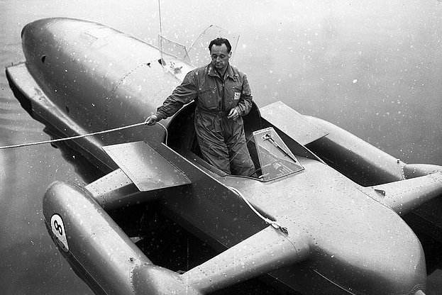 Campbell and K7 set seven (!) world water speed records. There may have been an eighth, but tragically Campbell was killed when the craft somersaulted on Lake Coniston, in Cumbria, on 4th January 1967. Reportedly, K7 had reached a max speed of 310mph on its first run up the lake that day.