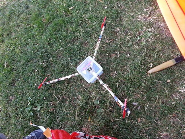 I hope to find an explanation to the issues I have, and show how even tiny motors can fly a 600g machine. Last crash landing broke the tupperware, so I'll be replacing that, but they're cheap to come by and eventually I'll be emulating the Boxcopter and landing on water I hope! I'll be writing about future developments as I have the time.