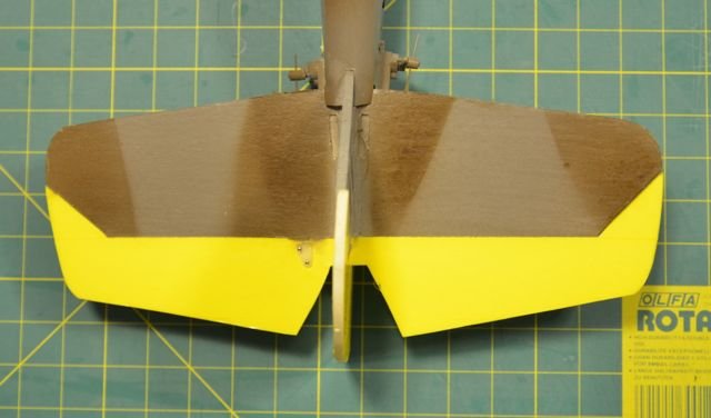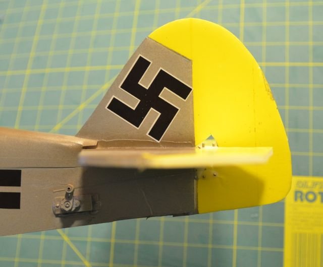 The tail was designed similarly - tranced the FT Spit and kept all parts that join with other parts the same. The vertical and horizontal stabilizers were modified to match the Messerschmitt looks, with proportions taken from the plans again. The bottom of the rudder was reduced in size to match the slightly thinner tail of the fuselage. The Messerschmitt rudder follows the line of the fuselage.