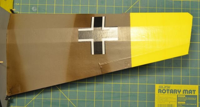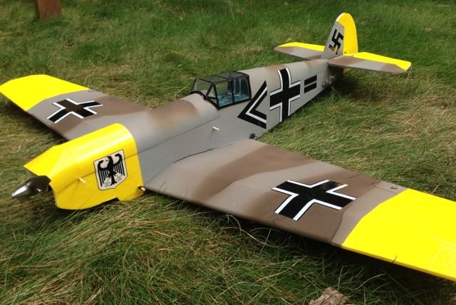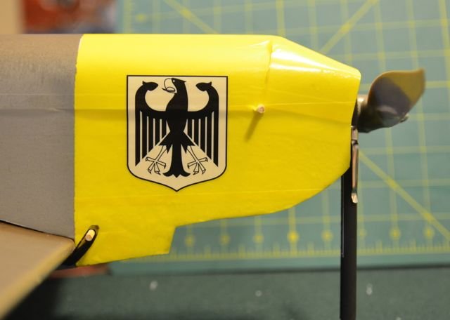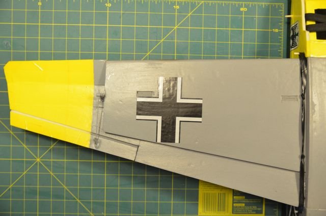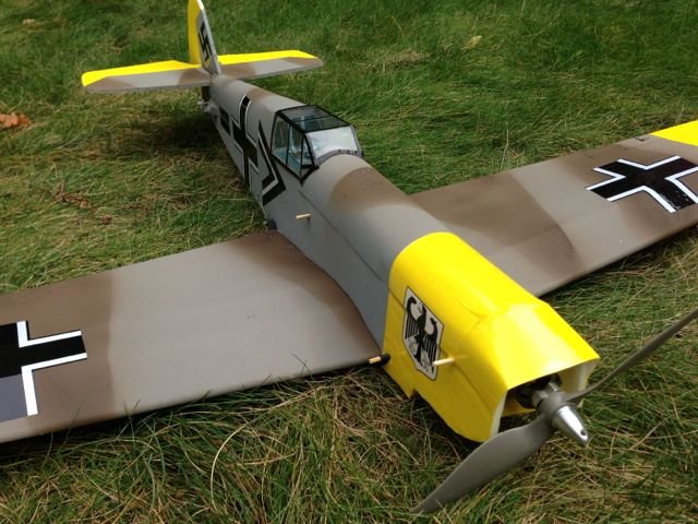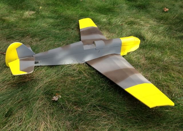 To really make it look like a Bf109, I finished taping the yellow tips, and painted it. I lightly varnished with oil-based minwax, then sprayed with $2 craft acrylic. You can pick your colour scheme, I went traditional to make it Messerschmitty as possible.
