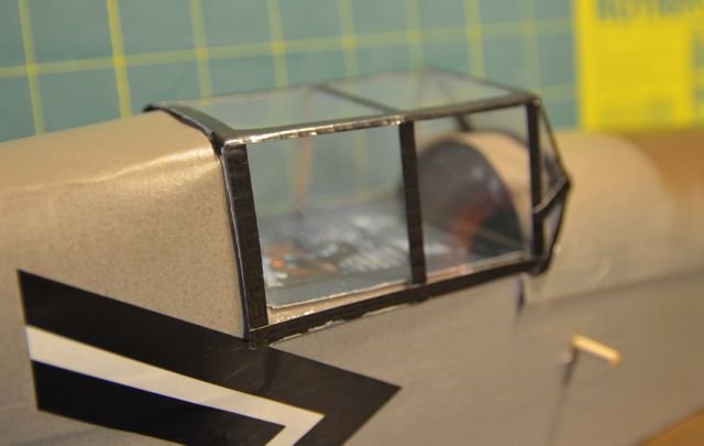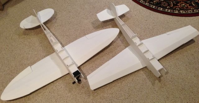 Lastly, a sheet of Hobby King Luftwaffe decals and a light coat of water-based minwax for belly landings. And a canopy. The canopy is deceptively easy. I put plans for it with the other parts. It is a single piece of clam-shell packaging (that hard clear plastic they insist on packaging stuff in) that is bent into shape and finished with black duct tape strips, all hot glued into place. You can also see the plane beside the painted Spit, for comparison (below).