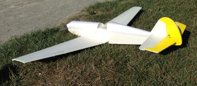 I used tape for the distinctive yellow parts, and taped it before painting so it really pops. This the plane on test flight day. It flew great, better than my wildest hopes, in fact. I discus threw it at 3/4 throttle and it just took off in a straight line and flew level (see video below). I did basic moves, and it was fine, but I did need to reduce the aileron throws a lot and give it some down trim. Rolls nicely, great for loops. It flies much like the Spit, but maybe a bit smoother even. The power system is pretty much as recommended for the Spit - NTM 1350 Kv and 8X4 prop. I will put a big spinner on it when I get one.
