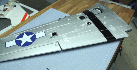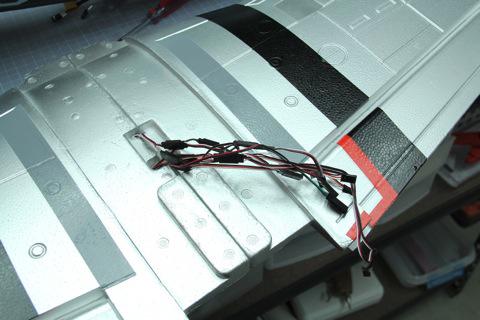 Wings put together. Lots of cables. 2 aileron servos, 2 flap servos, 2 navigation lights and 2 retracts.