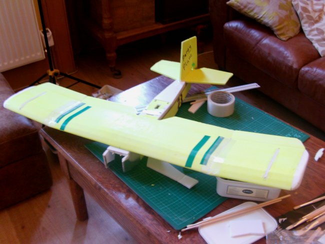 Yes, this is a rebuild of my Baby Blender. I had a bad belly-flop crash and the top wing managed to push the bottom wing down, folding and breaking it where the wing was cut to inset it into the fuselage.