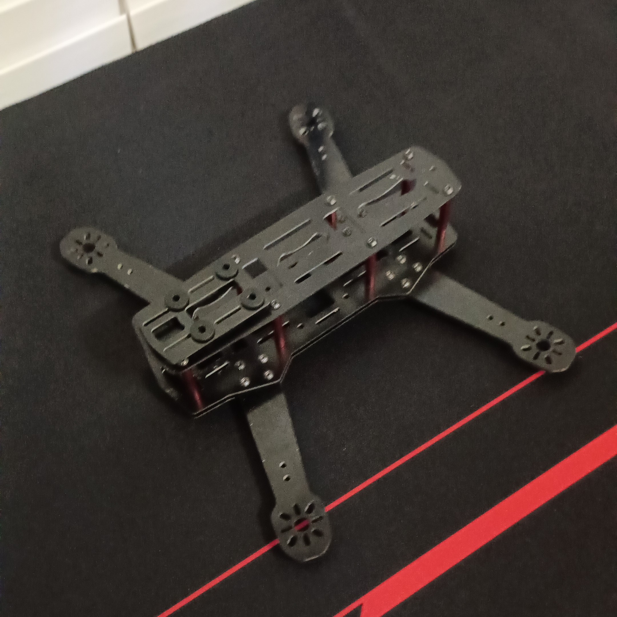 The carbon fiber frame provides a lightweight yet strong structure, ensuring durability during flight. The 250 mm size refers to the diagonal distance between the motors, making it compact and suitable for many drone applications.