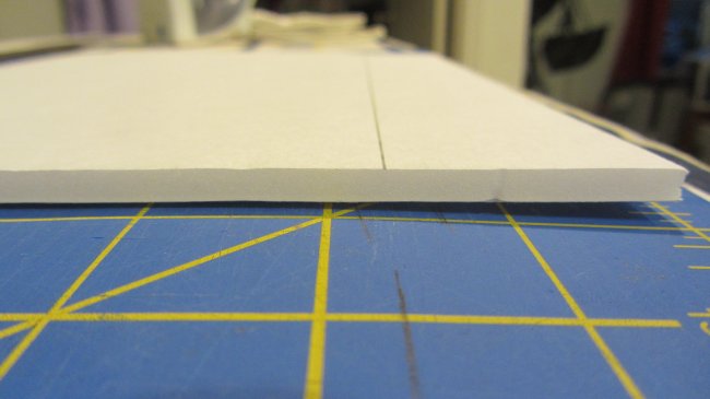 I have been designing, building, and flying with dollar tree foam for almost 3 years. One of the aspects that I have had the hardest time with (because I seldom crash) are the hinges. The 50% score cut and bevel, even with the hot glue reinforcement, delaminates and sometimes is just too flexible for very precise control. On my last few planes, I have experimented with an alternative hinge method. This can only be done if the paper on both sides of the foam at the hinge has not been cut already (no 50% score cut). That means this technique is for scratch-builders. This method shortens the total wing chord across the hinge by 1/8 inch. Plan accordingly or just don't finish cut the wing/tail/etc. until after the hinge has been made.