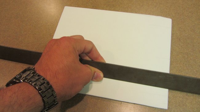 I use a bar of 1/8" thick steel that has a very square edge (or a hardwood block with a sharp straight edge) for this. I line the edge up with the drawn reference lines and press the edge into the foam. I press one corner into the paper right on the line. I alternate pressing the paper on both sides of the foam sheet closer together. Do this on a solid, flat work surface.