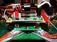 I used five 1" servo leads and connected them from the KK2 to a Turnigy 9x8cv2 receiver board. Used two more capacitors and glued them to the foam and receiver board with enough clearance to still access the KK2 programming buttons. Finished up by connecting the signal leads from the esc's to the KK2 starting with 1,2,3,4. Please note that 1,3 are cw and 2,4 are ccw.