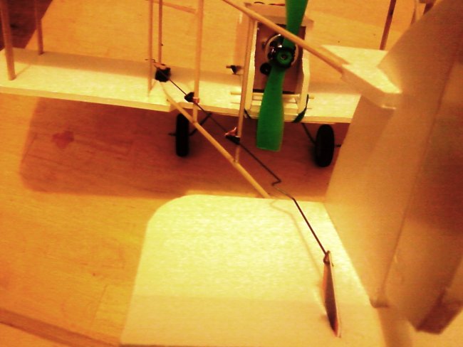 The steerable tail wheel was made up from wire and a length of cotton bud shaft glued and taped onto the end of the fuselage. This was the start of my simple tail steering system that I now use on all my models. I wound up a little spring and bent the wire to tuck the wheel beneath the fuselage - just like the real thing. I bent the steering/tiller lever to project on the opposite side of the centreline to the rudder control horn...