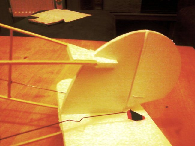 The vertical and horizontal stabilizers were fairly simple, but to get the look of the overlapping elevator and rudder I reinforced the fragile foam projections with skewers. I also used a glue method for rounding the edges of the foamboard. (Nothing like as successful as the hot iron system tyoho demonstrated in his “HOT tip, iron your edges” article, but I did go on to use the technique on my first Tribewt.)