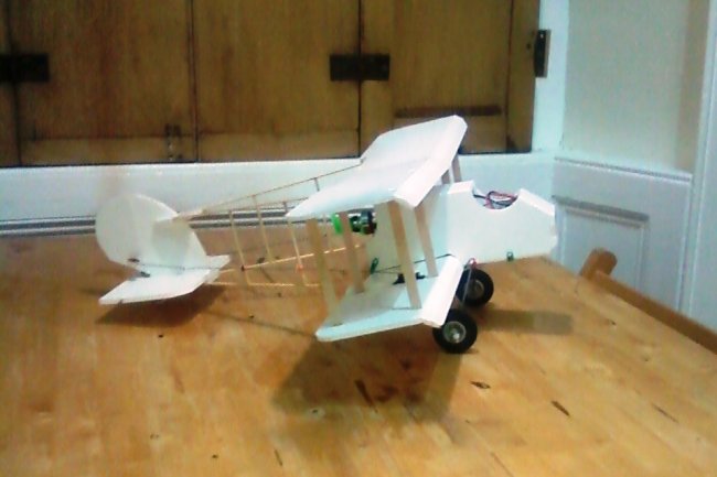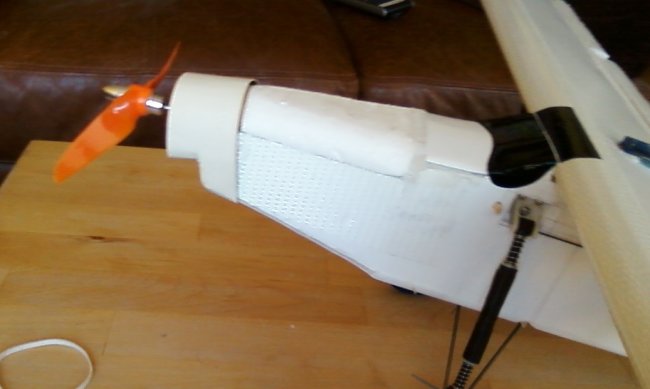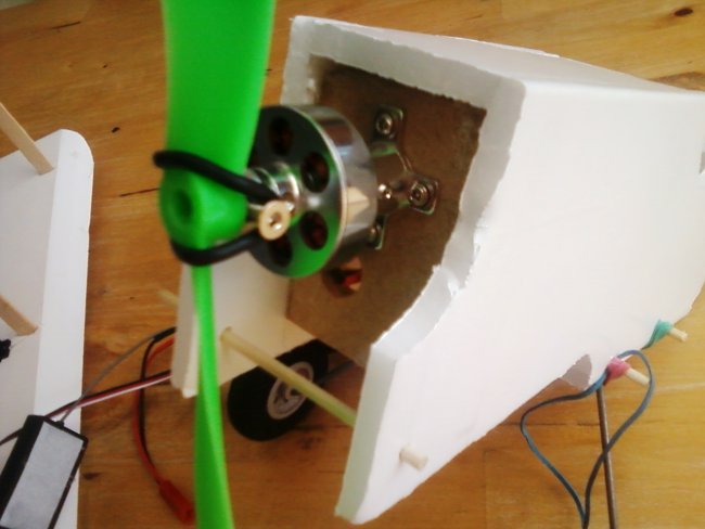 The motor is a 1300kv HexTronik 24gram Brushless Outrunner, and the prop an 8x4 slow fly cut down to 6 inches. Plenty of power for the weight of the airframe.