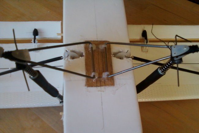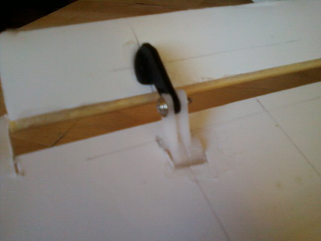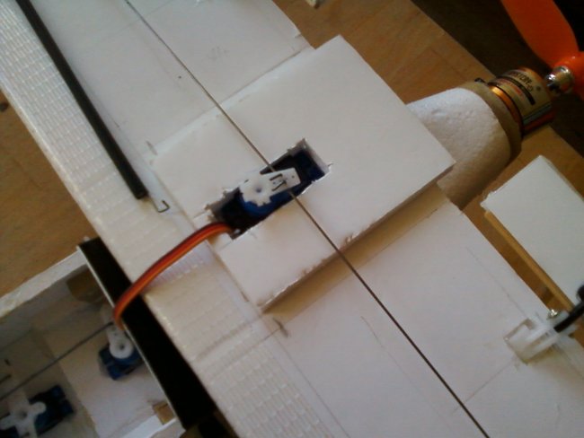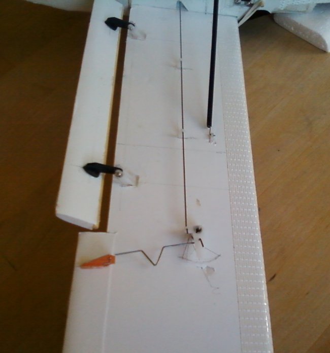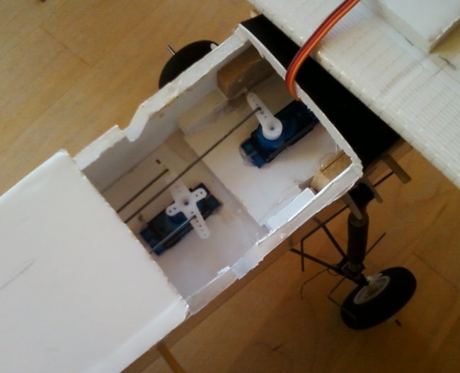 I was going to install separate wing servos for the ailerons, then decided just to go with a single centrally mounted servo operating the ailerons through control rods and levers….