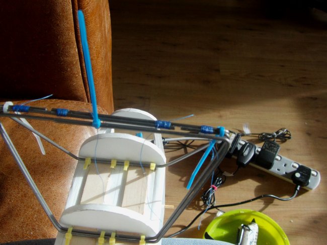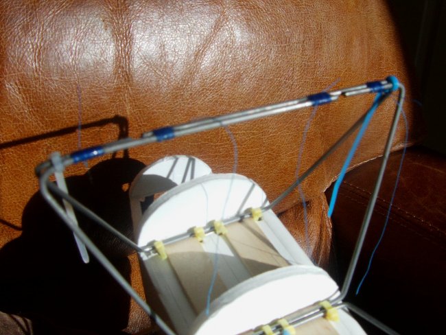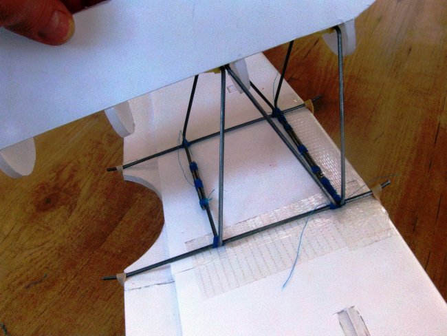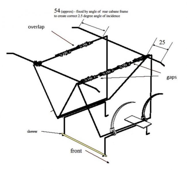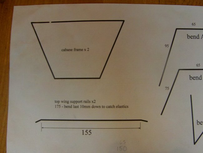There’s bending guides for the cabane frames in the plans. The two front frames are made up as shown in this picture, with no overlap. The third frame is identical in shape, but the wires at the top have a good overlap so they can be joined.