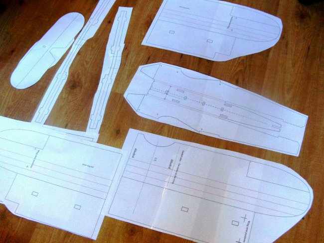 After copying all the profiles and sorting all the assembly details and geometry; fuselage, wings, cabane frame, interplane struts and undercarriage, I printed up my components on A3 paper and stitched them all together with clear tape. Note the top wing, shown in the foreground here, is made from asymmetric parts; one side includes the centre flat that will sit on the cabane platform, the other side is just the outer wing.