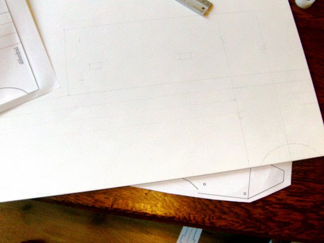 I didn’t get a picture at the time, but here’s my full-size copy of the cabane geometry drawing positioned flush with the top of the box fuselage. You can rotate and position the rear strut to get the correct angle of incidence before binding the mounting rails in place. I had a little rethink about my initial CG and the angle of incidence, so ignore the figures in this photo, they’ll be right on the amended drawing.