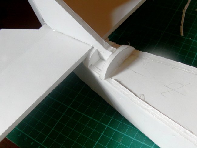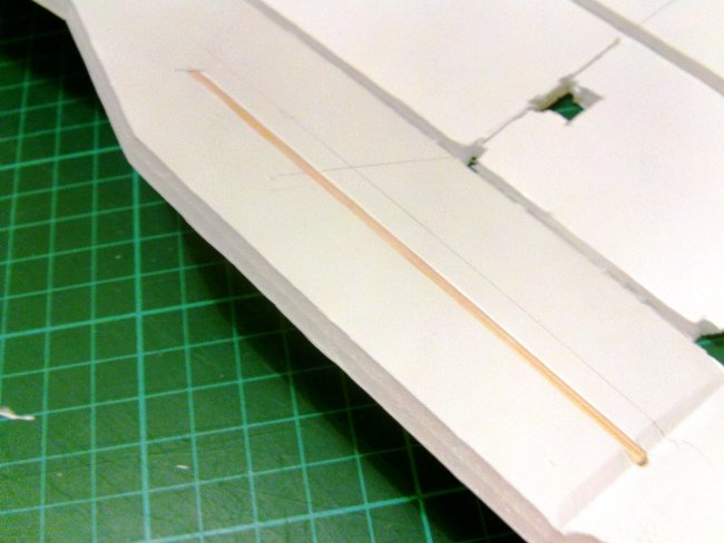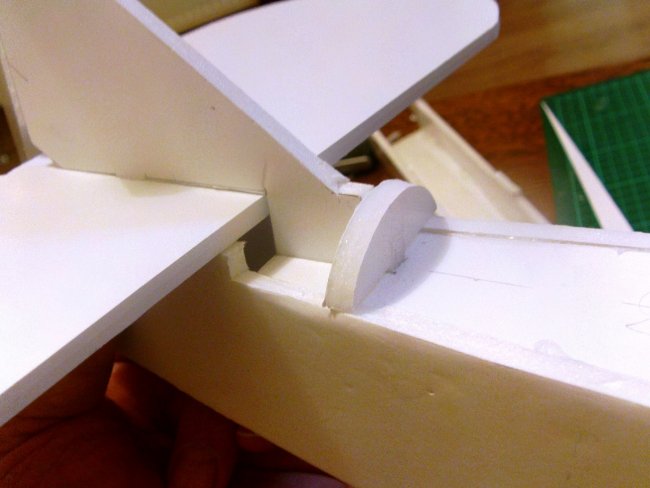 I ‘filed’ a hole into the foam with the side of a drill bit to bring the snakes out just under the horizontal stabiliser. A small, round rat’s tail file would also be good for this job. Because of the need to pass through glue, just poking a skewer through will be quite hard. Glue the end of the snake in place to keep that little corner of the tail-to-fuselage join strong.
