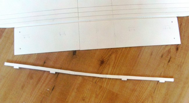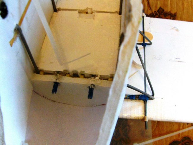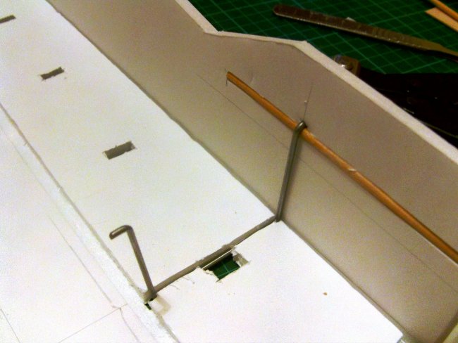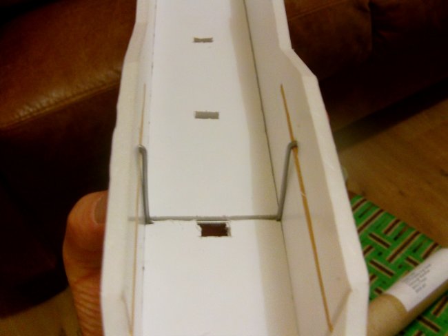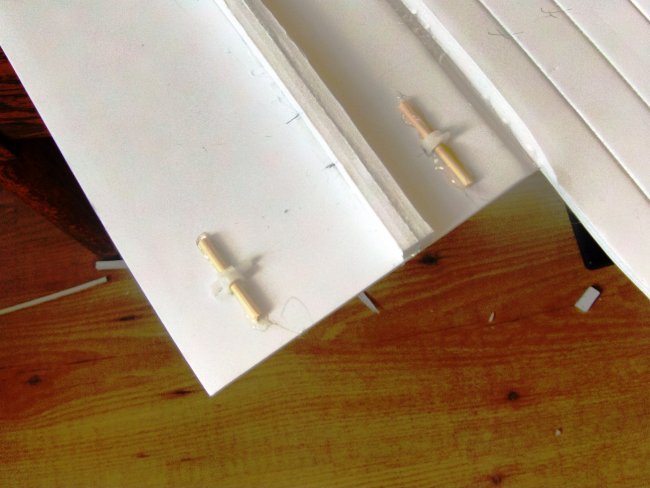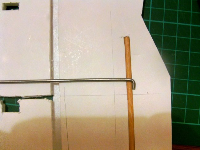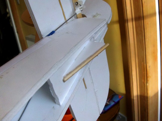 I needed a way to integrate the cabanes into the foam board fuselage. The method I chose uses two transverse ‘rail’ mounts which are hooked onto skewers embedded in the fuselage sides.