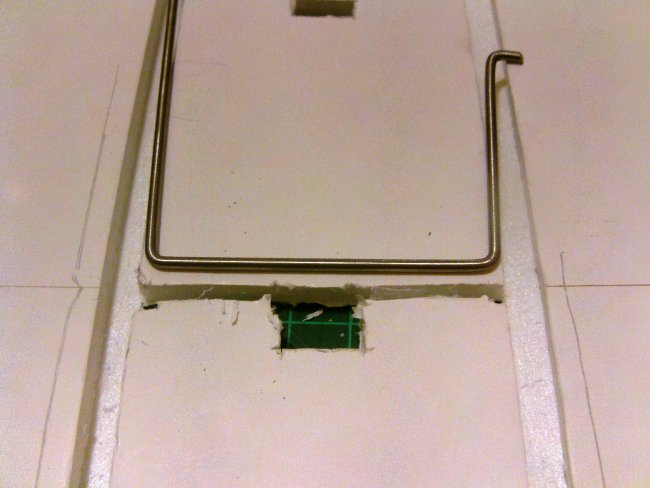Here’s the wire in place for a final test fit. I used a sharp skewer and a ‘wiggle’ to poke holes in the foam where the ends of the wire hook over the skewer. Take care not to go all the way through the fuselage. It’ll be much neater if the ends of this wire remain hidden. After you’ve made-up a second ‘identical’ cabane mount, you can glue-up the box fuselage. You could glue it up with the mounts in place, but that would be very fiddly. Don’t worry, there’s a ‘neat’ way to do it after the fuselage is formed, so go ahead and glue it up without them.